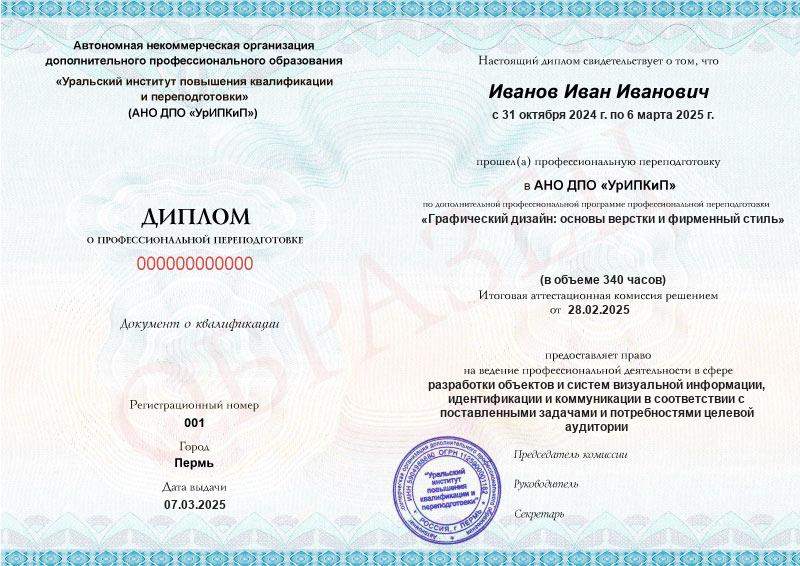 Да, дипломы и удостоверения оформляются в соответствии с действующим законодательством РФ. Документы печатаются на специальных бланках, заверяются печатью АНО ДПО «УрИПКиП».