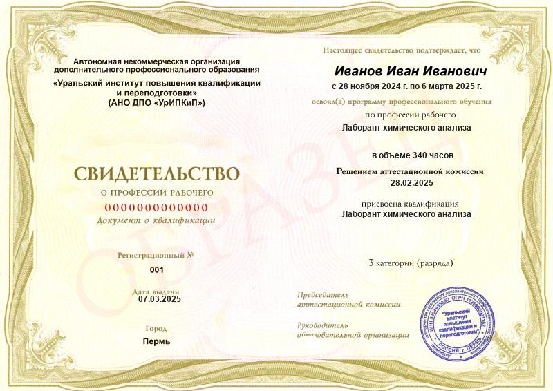 • Свидетельство АНО ДПО «МАСХ» о профессии рабочего с присвоением квалификации «Лаборант химического анализа» — выдается выпускникам со школьным аттестатом