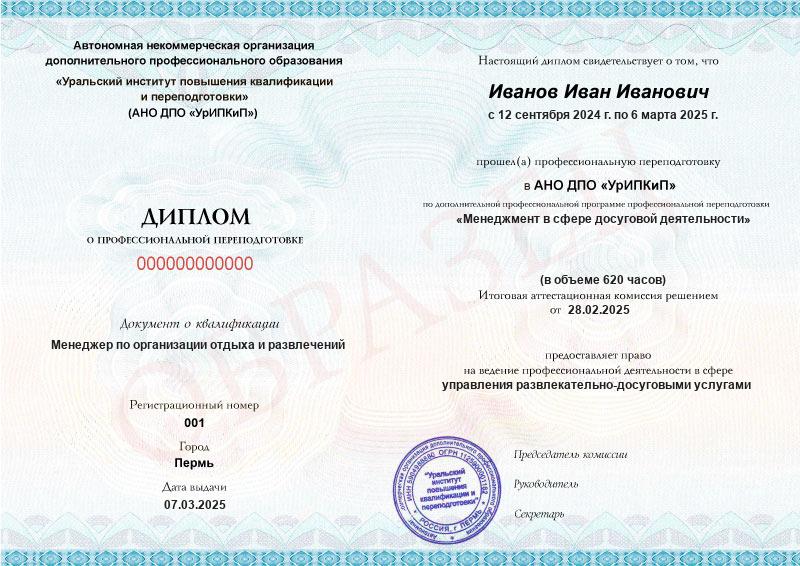 - Квалификация: Менеджер по организации отдыха и развлечений