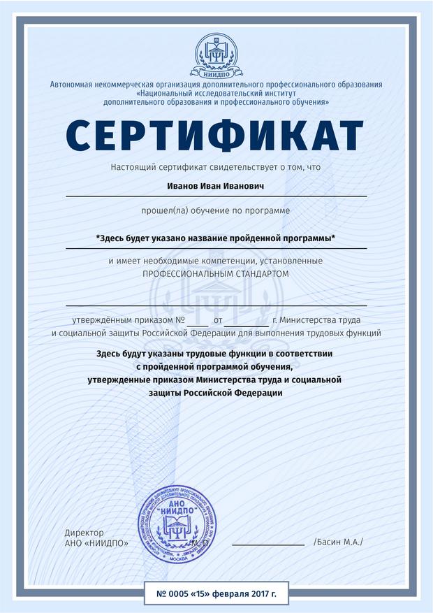 - Образец удостоверения о повышении квалификации.