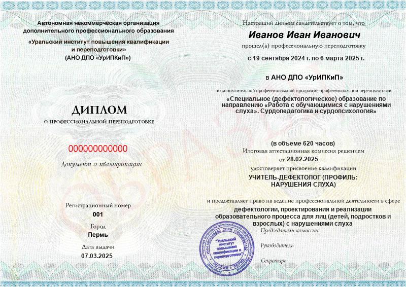 • Квалификация: Учитель-дефектолог (профиль: нарушения слуха)