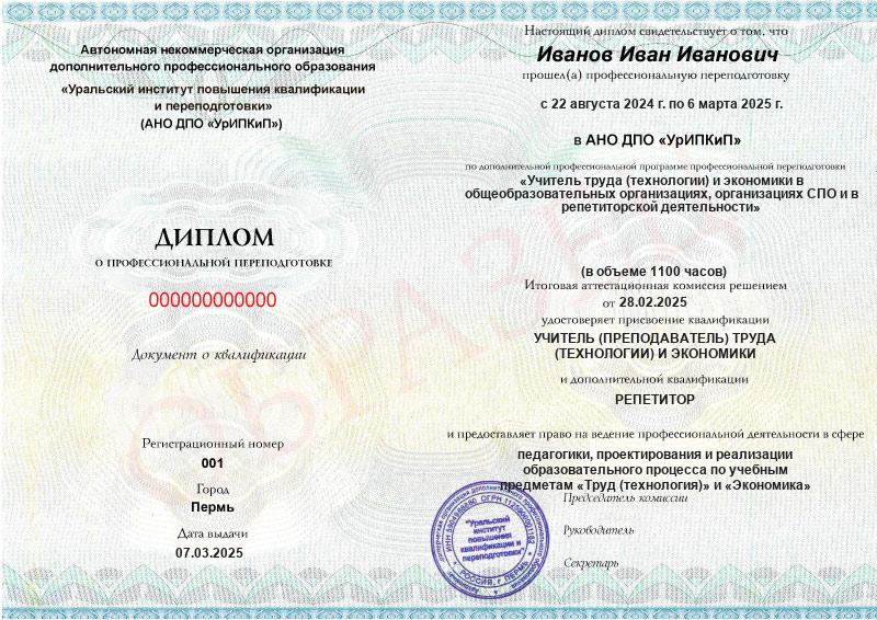 Курс обучения Учитель труда (технологии) и экономики в общеобразовательных организациях, организациях СПО и в репетиторской деятельности (1100ч)